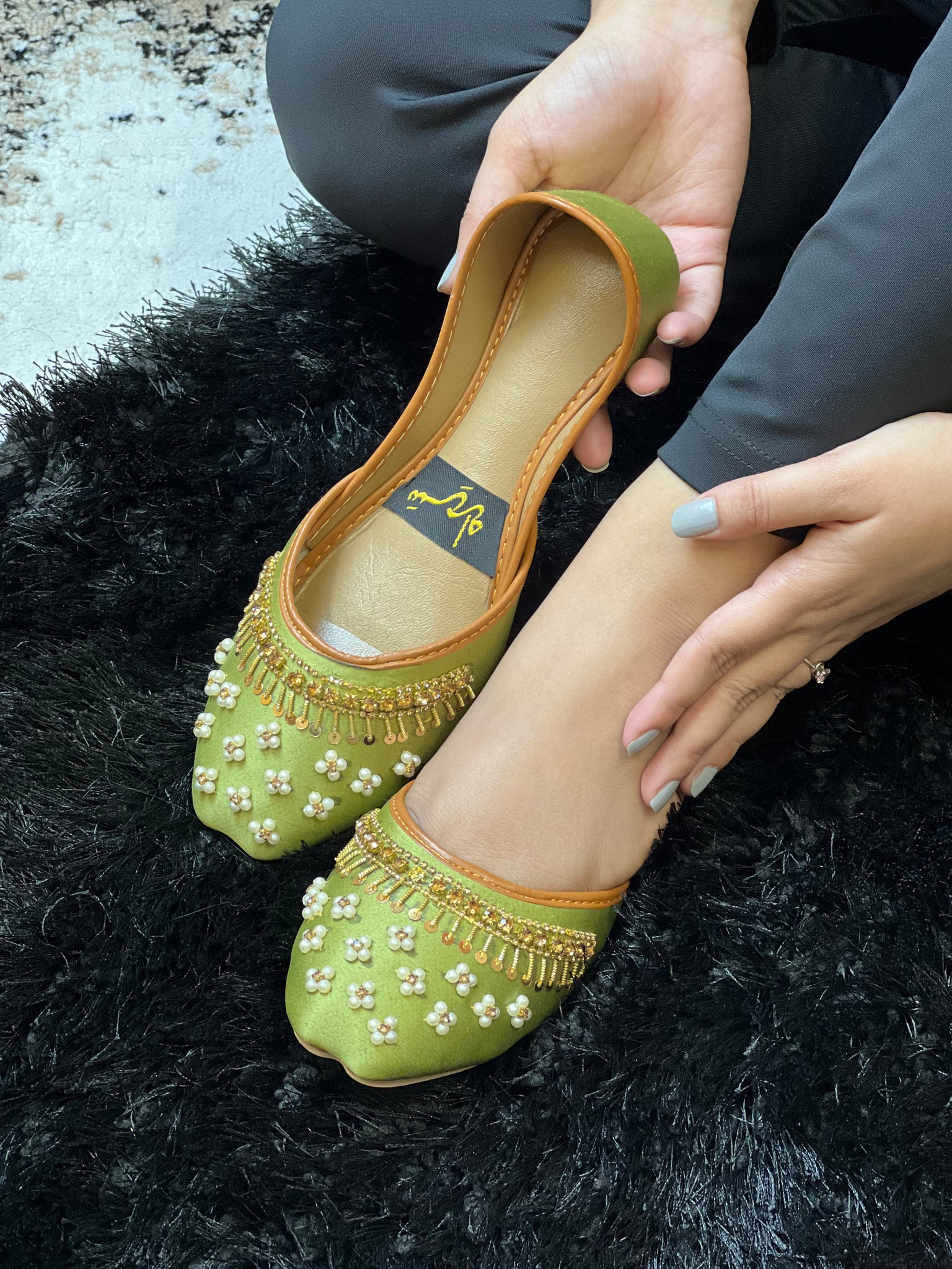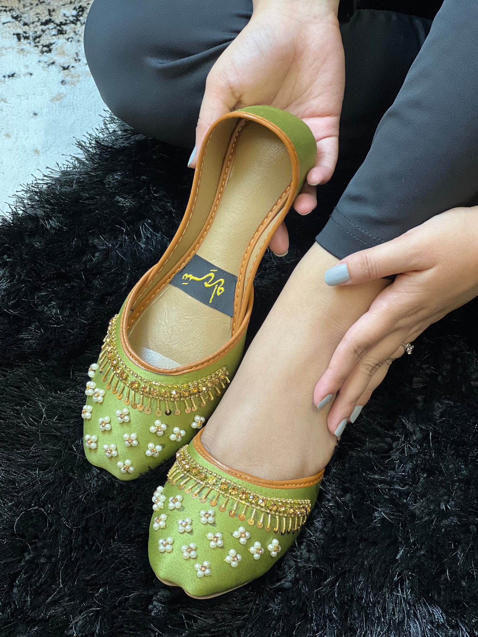 Green Aura embodies the calm beauty of nature wrapped in timeless elegance. Handcrafted in a soft olive hue and adorned with fine pearl blossoms and golden embroidery, this khussa captures a balance of serenity and sophistication.