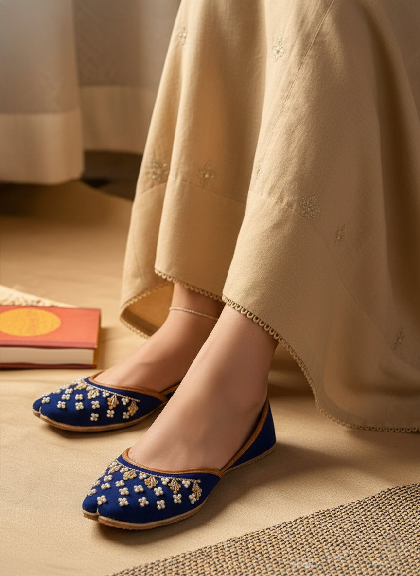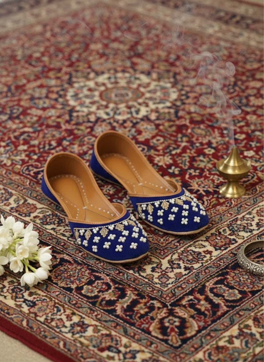Draped in the richness of royal blue, Meher-e-Neel is a tribute to timeless sophistication. Embellished with hand-stitched golden motifs and delicate pearl accents, this khussa captures the essence of heritage craftsmanship with a modern, elegant edge.