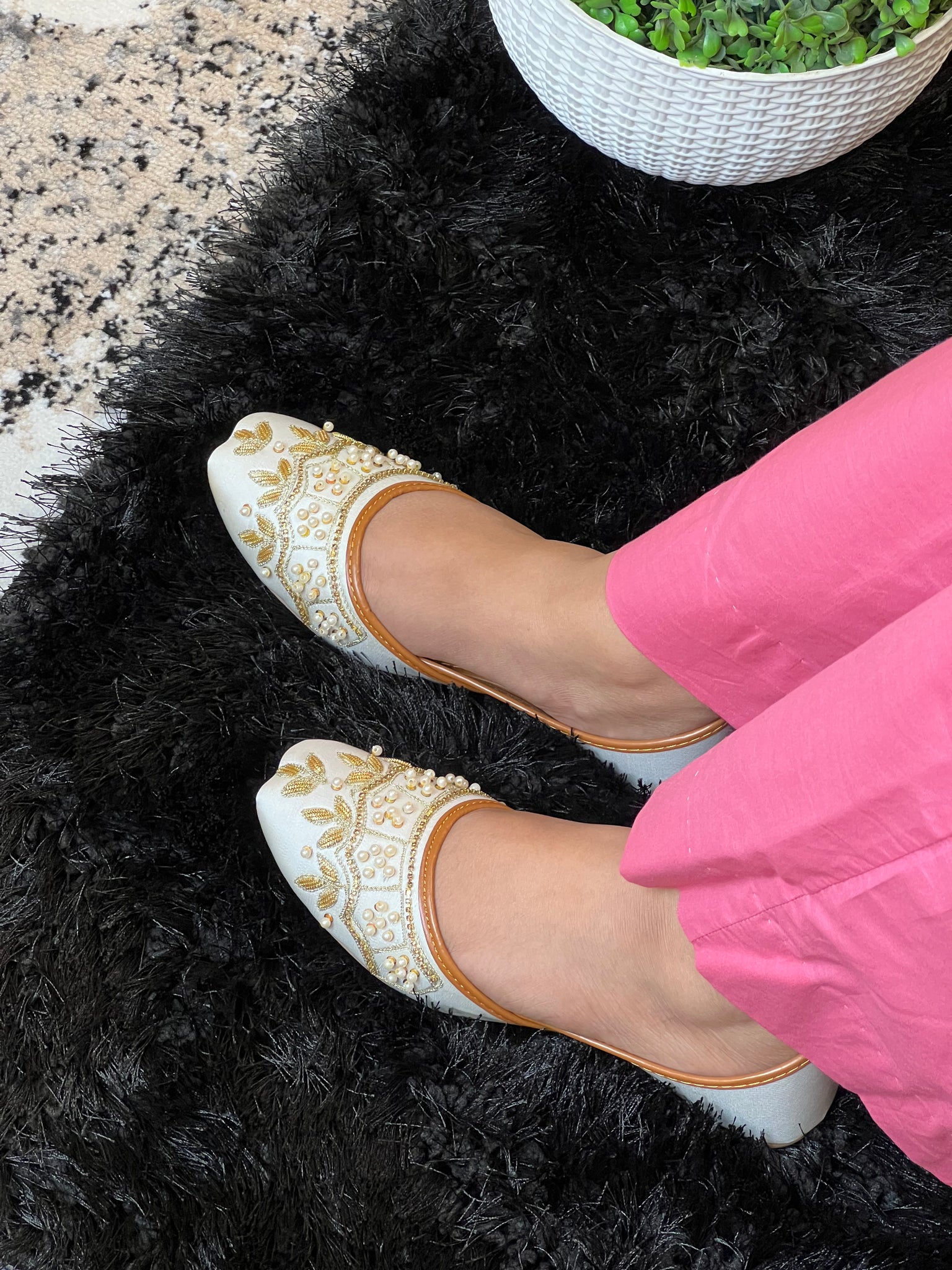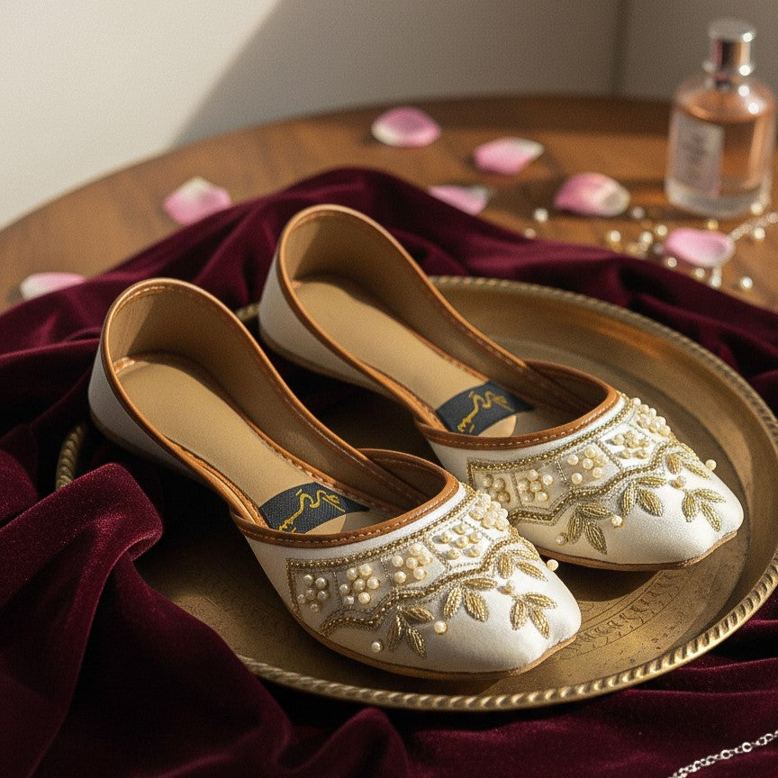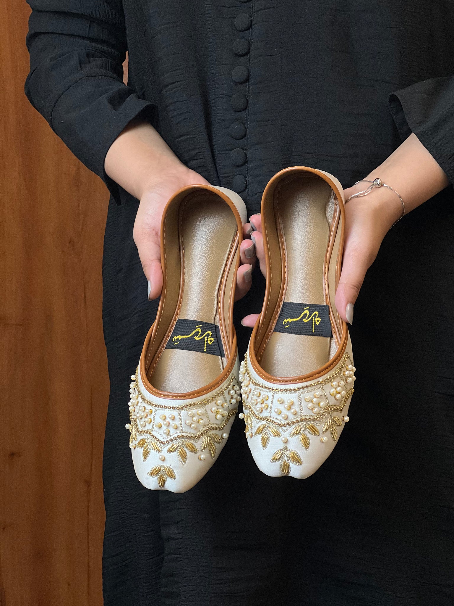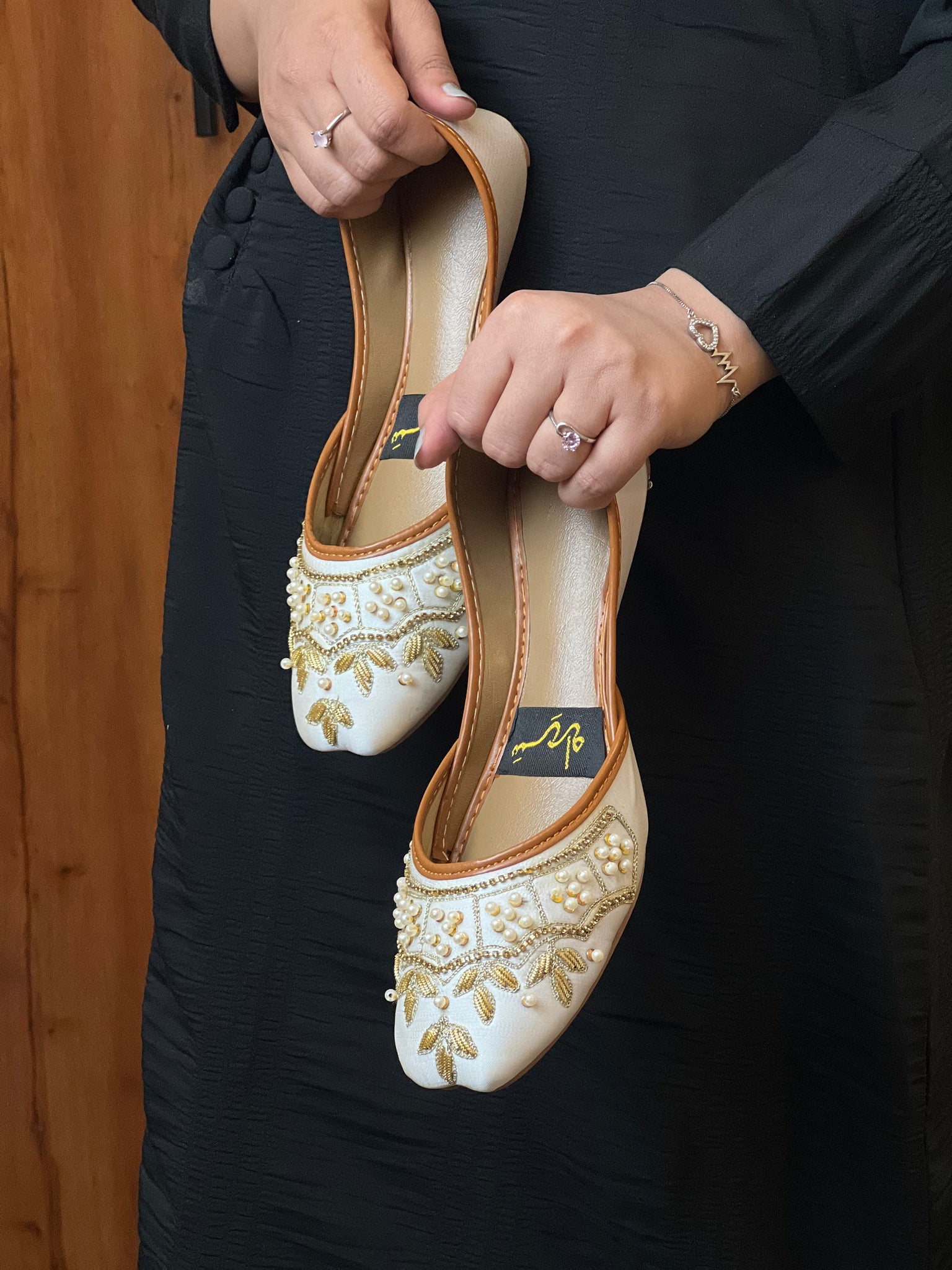 Moti-e-Zar is a celebration of pure sophistication, adorned with delicate pearls and golden embroidery that shimmer with understated luxury. Crafted in soft ivory satin and hand-finished by skilled artisans, this khussa embodies the essence of heritage elegance with a modern touch.